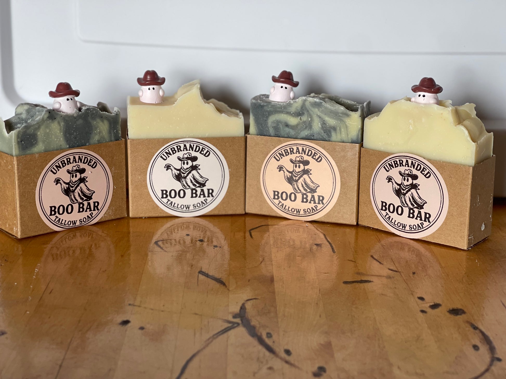The Boo Bar is a little spooky, a little sweet, and all-natural through and through. Handcrafted with grass-fed tallow, olive oil, and coconut oil, this bar lathers rich and creamy, leaving skin clean and soft. The scent is a calm, comforting blend of chamomile, sandalwood, lime, amber, and a hint of mystery — warm, woodsy, and peaceful enough to soothe even the wildest soul.